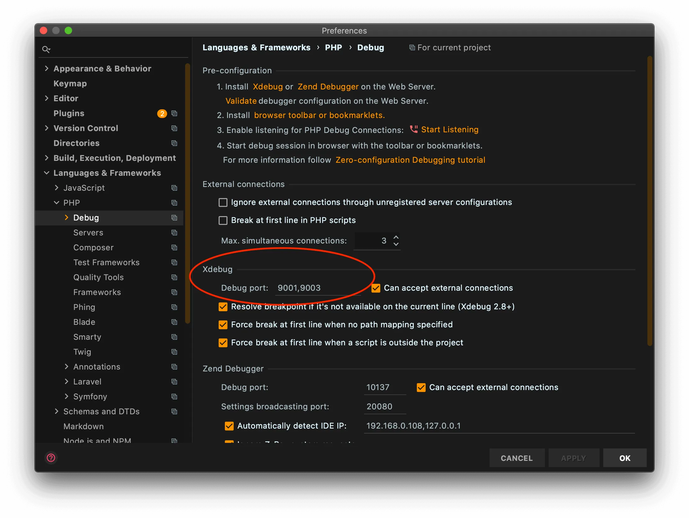 Finally, verify that the PHP > Debug section in your PHPStorm setting to make sure that the Xdebug port there points to the same port you defined in the xdebug.ini file.