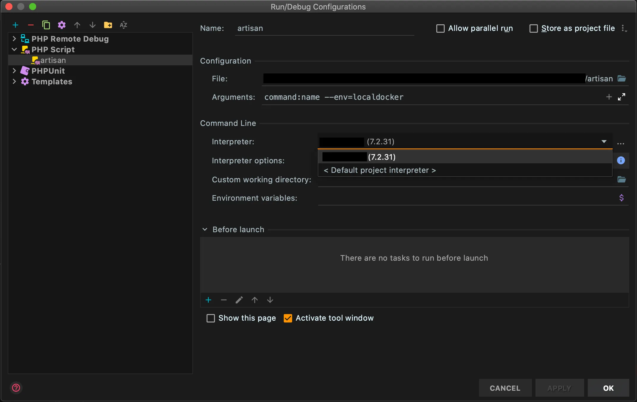 The “File” should point to your local machine’s Laravel artisan file.