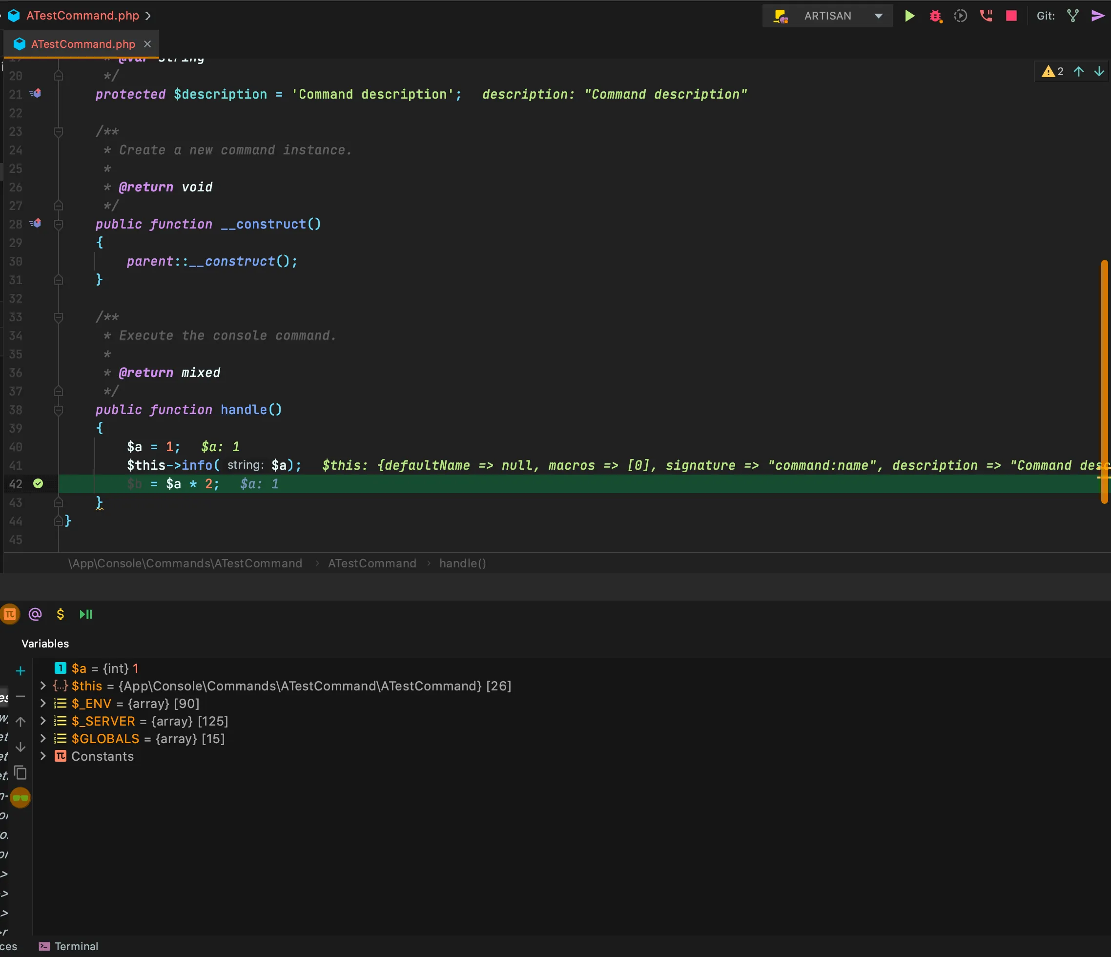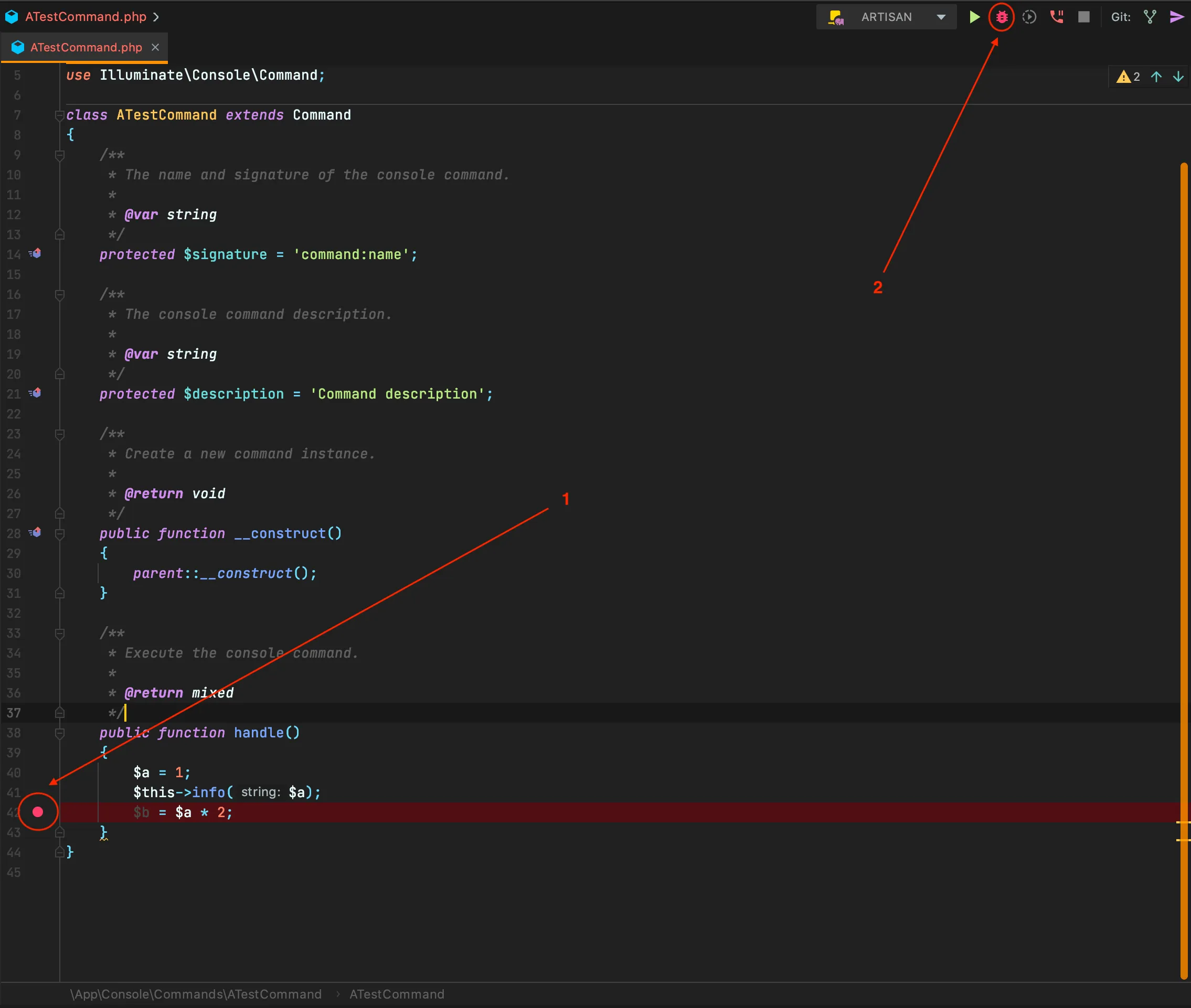 Refer to the image below. I created a simple artisan command for this article (in fact, the content is exactly what make:command generates, plus some dead simple code for demonstration). After setting a breakpoint (as arrow 1 in the image), pressing “Start debug” icon (as arrow 2) to start the debug session.