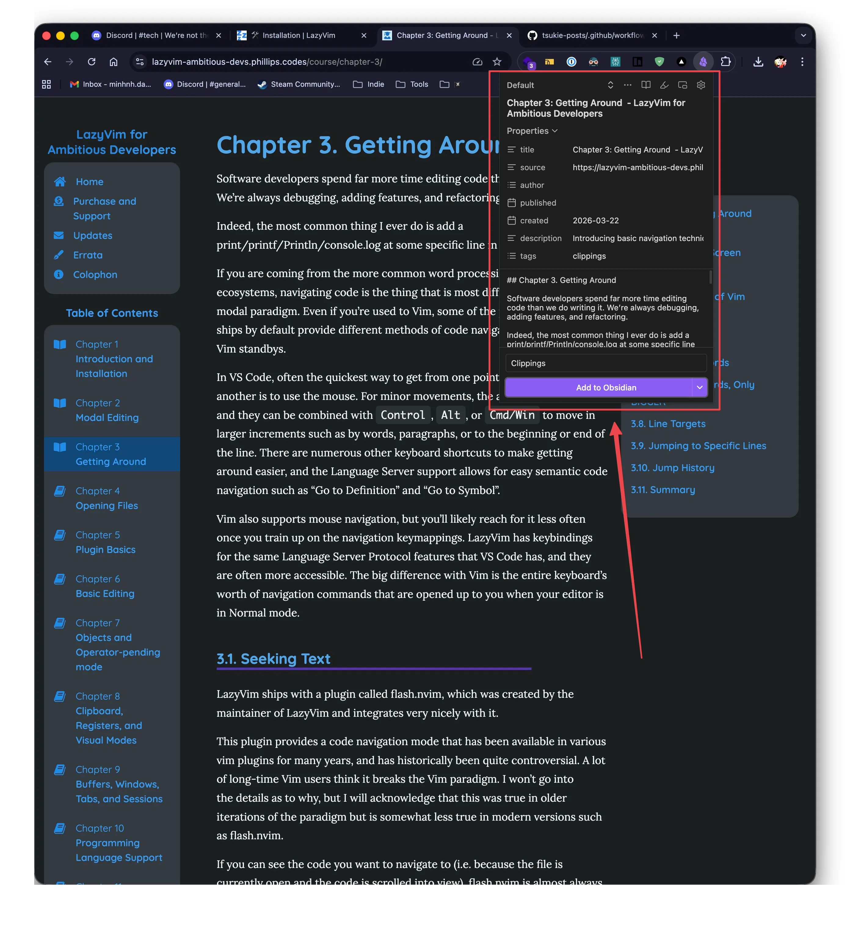 The difference this makes is subtle but real. A saved link in a bookmark manager is dead storage. A clipped article in Obsidian can link to your notes on the same topic, surface in graph view next to related ideas, and actually get read and used instead of sitting in a list forever. Bookmarks become part of the knowledge base instead of a separate graveyard.